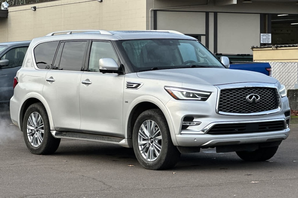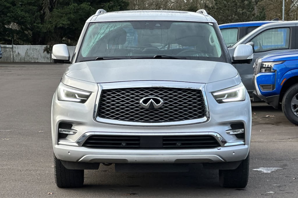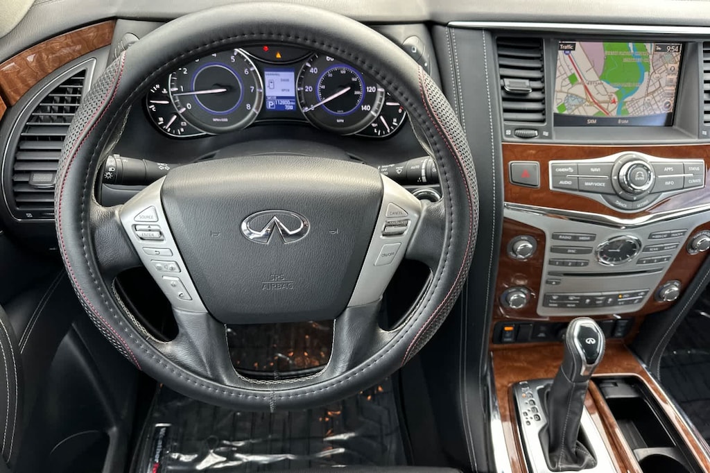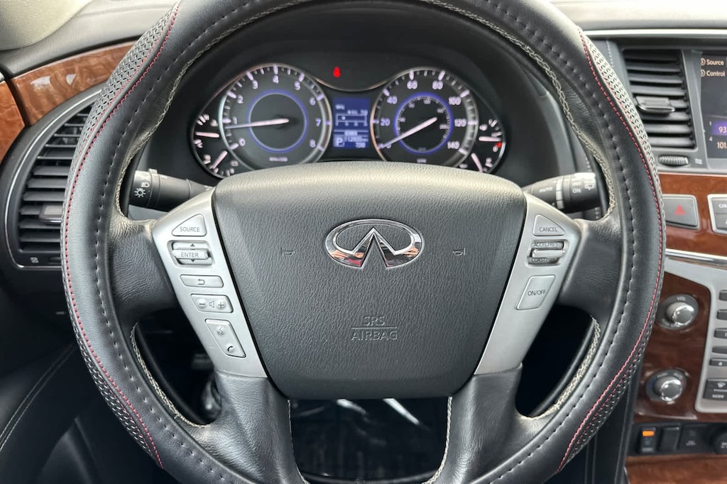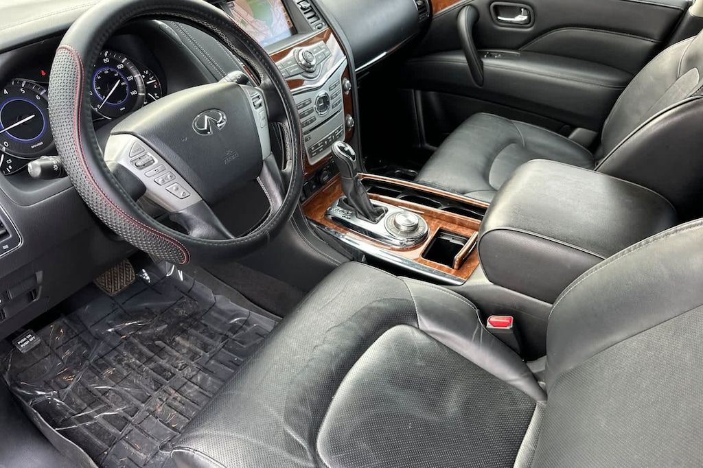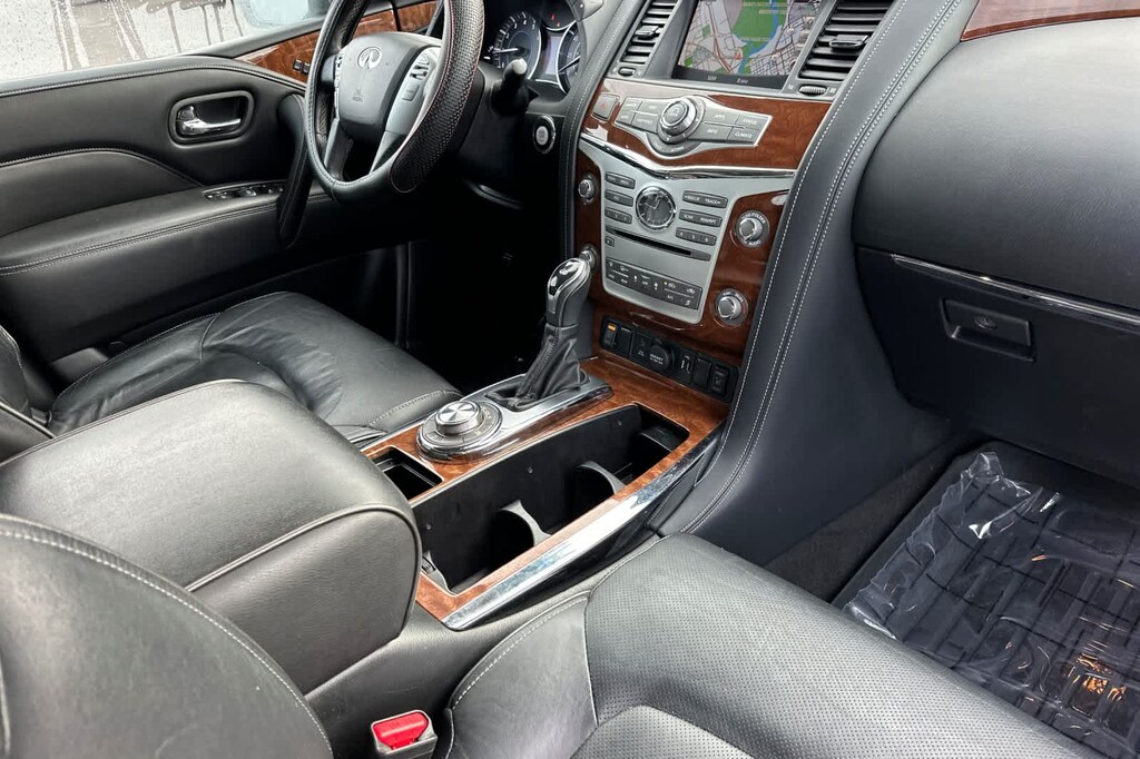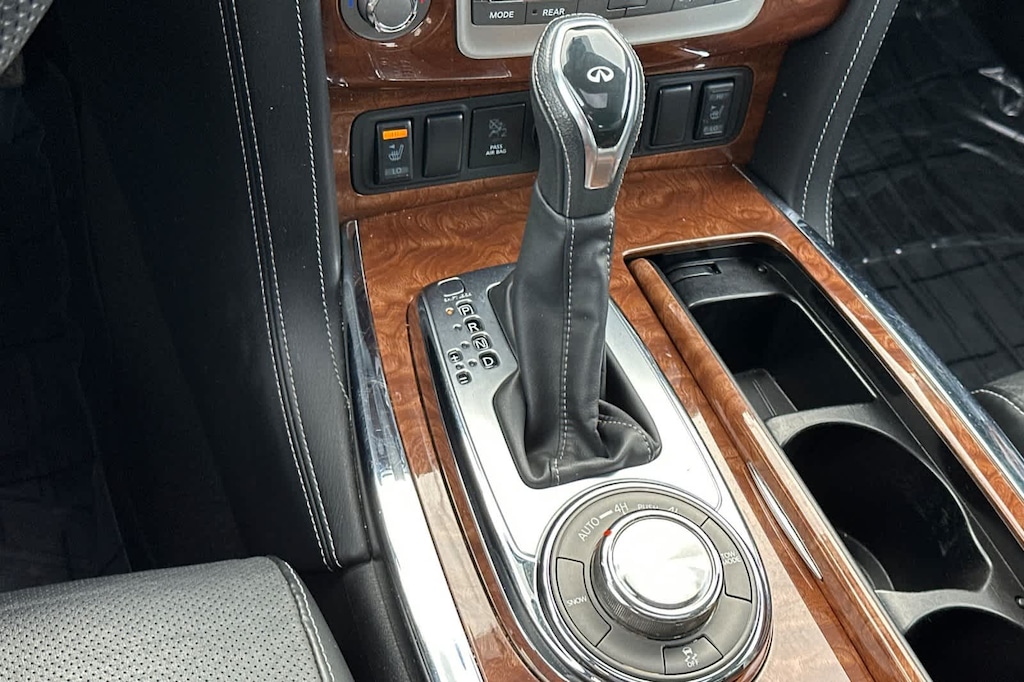 Leather Seats, Third Row Seat, Navigation. Rear Spoiler, MP3 Player, Sunroof, Rear Seat Audio Controls, 4x4, Onboard Communications System, Aluminum Wheels. INFINITI LUXE with Liquid Platinum exterior and Graphite interior features a 8 Cylinder Engine with 400 HP at 5800 RPM*.