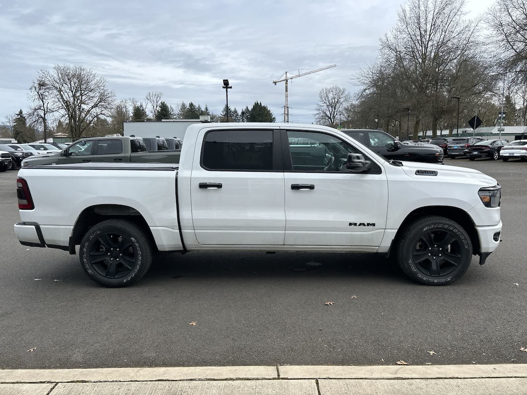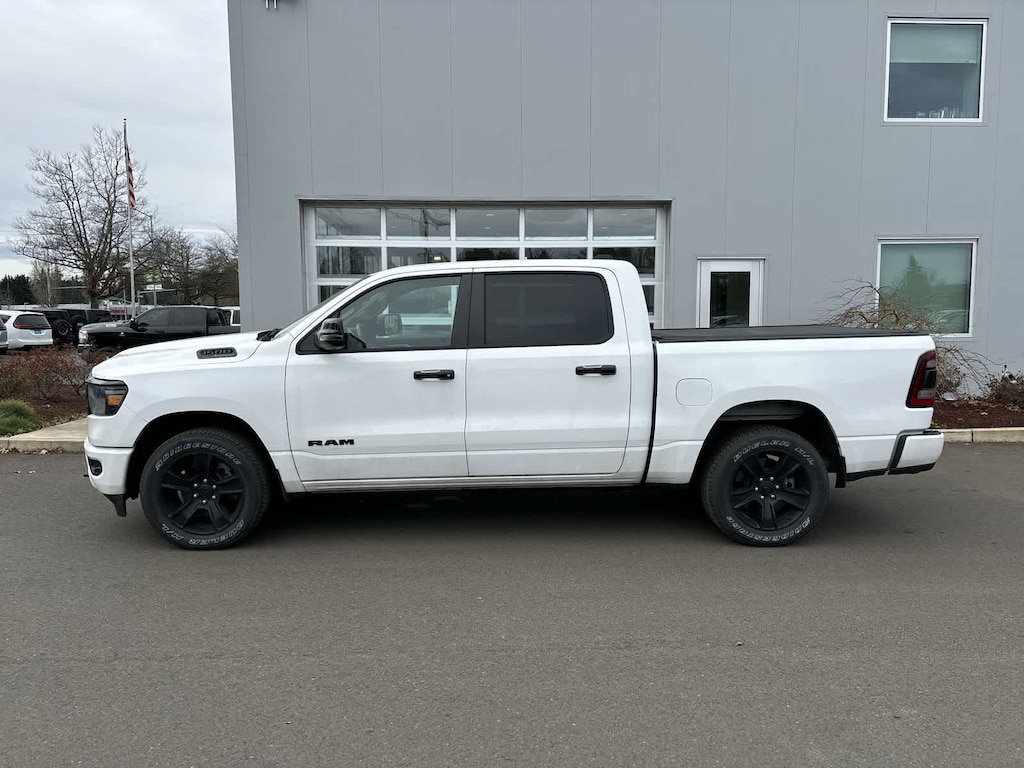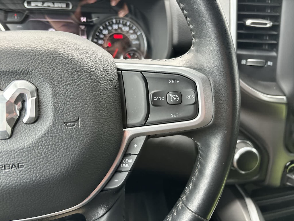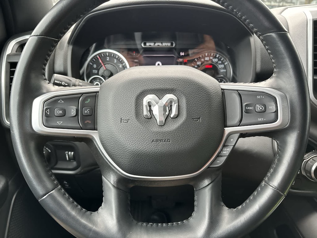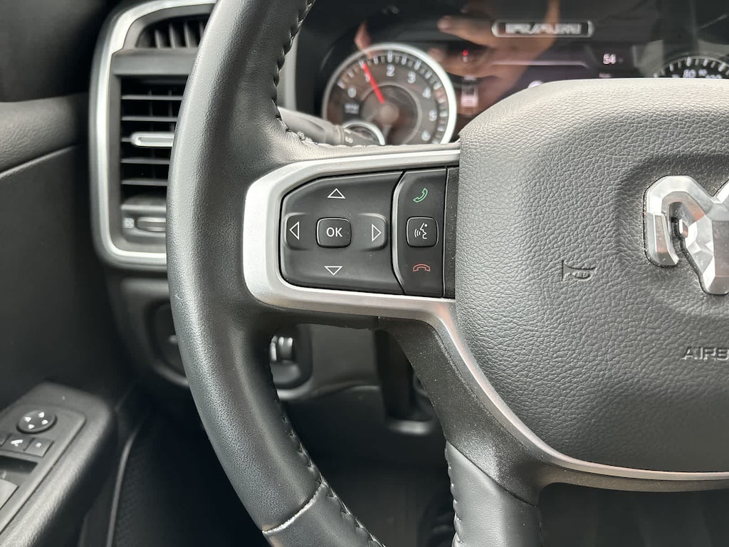 BIG HORN LEVEL 2 EQUIPMENT GROUP Google Android Auto®, USB Host Flip, Power Adjustable Pedals, For More Info, Call 800-643-2112, Front Fog Lamps, Glove Box Lamp, Media Hub w/2 Charge Only USBs, Heated Front Seats, 8.4 Touchscreen Display, Class IV Receiver Hitch, Security Alarm, Black Premium Power Mirrors, Apple CarPlay®, Remote Start System, SiriusXM Satellite Radio, 9 Amplified Speakers w/Subwoofer, 115V Auxiliary Power Outlet, Universal Garage Door Opener, Electric Shift On Demand Transfer Case, 2nd Row In Floor Storage Bins, Sun Visors w/Illuminated Vanity Mirrors, LED Footwell Lighting, Power 2-Way Driver Lumbar Adjust, Bluetooth® Handsfree Phone & Audio, Rear Window Defroster, Integrated Center Stack Radio, ParkSense Front/Rear Park Assist w/Stop, Rear View Auto Dim Mirror, Rear Power, ENGINE: 5.7L V8 HEMI MDS VVT ETORQUE Active Noise Control System, Heavy Duty Engine Cooling, Passive Tuned Mass Damper, Dual Rear Exhaust w/Bright Tips, HEMI Badge, 23 Gallon Fuel Tank, 18 Aluminum Spare Wheel, NIGHT EDITION Tires: 275/55R20 OWL All Season, Bridgestone Brand Tires, Accent Color Premium Power Mirrors, Exterior Mirrors w/Supplemental Signals, Black Headlamp Bezels, Exterior Mirrors Courtesy Lamps, Auto Dim Exterior Driver Mirror, Black Exterior Truck Badging, Anti-Spin Differential Rear Axle, Wheels: 20 x 9.0 Premium Paint/Polished, Accent Color Door Handles, Black Interior Accents, Dual Exhaust w/Black Tips, Power-Folding Mirrors, Body Color Front Bumper, Body Color Rear Bumper w/Step Pads, RAM Grille Badge - Black, Black Painted Exterior Mirrors Caps, BLIND SPOT & CROSS PATH DETECTION LED Taillamps, PROTECTION GROUP Transfer Case Skid Plate, Steering Gear Skid Plate, Front Suspension Skid Plate, Fuel Tank Skid Plate, Tow Hooks, TRANSMISSION: 8-SPEED AUTOMATIC (8HP75), BLACK, DELUXE CLOTH BUCKET SEATS Power 8-Way Driver Seat, Center Console Parts Module, Bucket Seats, Manual Adjust 4-Way Front Passenger Seat, Full Length Floor Console, Rear Center Armrest, Power 2-Way Driver Lumbar Adjust. Ram Big Horn with Bright White Clearcoat exterior and Black interior features a 8 Cylinder Engine with 395 HP at 5600 RPM*.