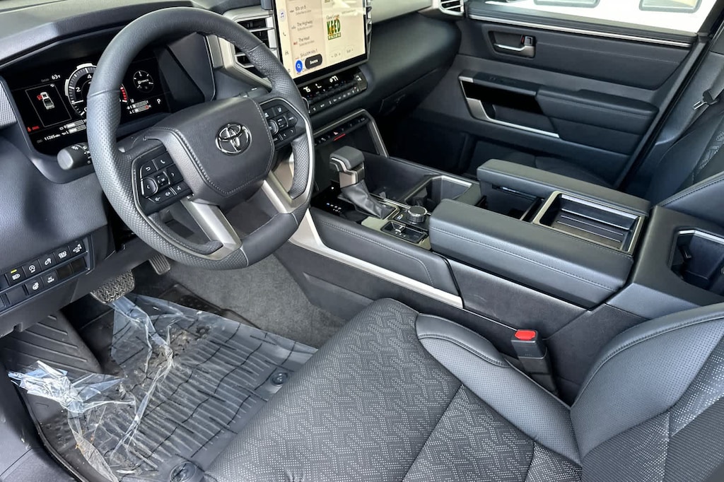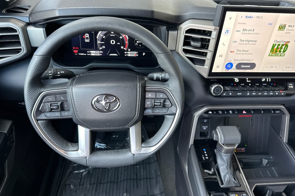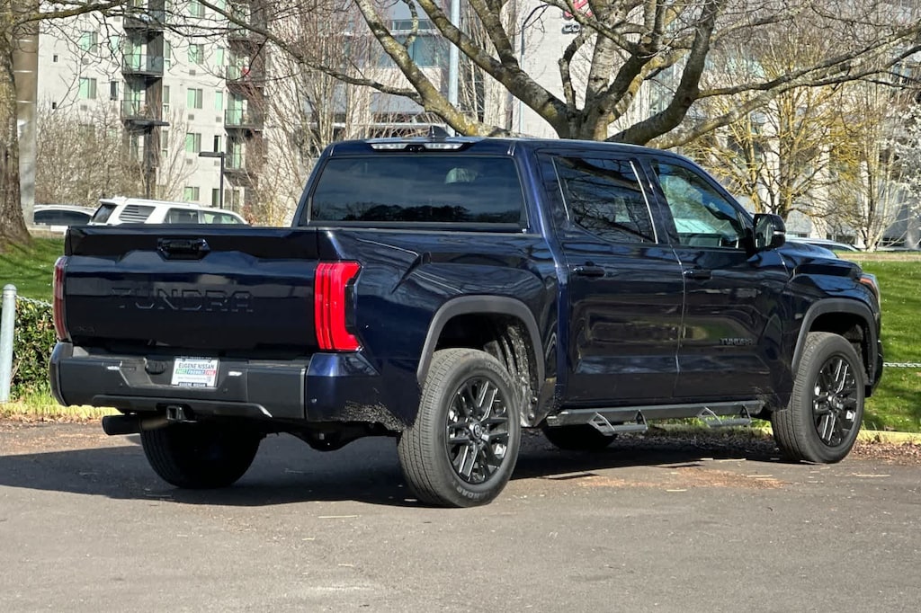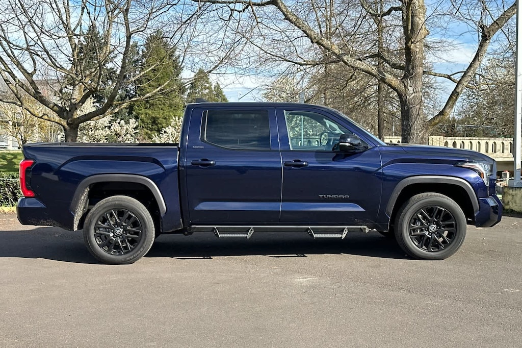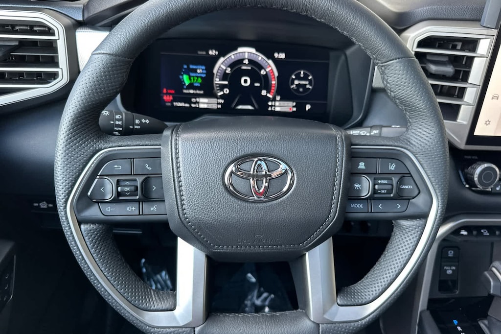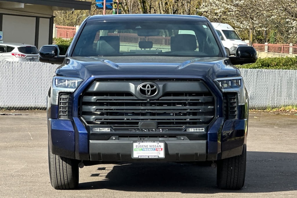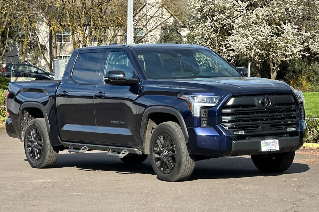 POWER TILT/SLIDE PANORAMIC SUNROOF power sunshade, PANORAMIC VIEW MONITOR PACKAGE Panoramic View Back Monitor, PREDATOR DROP STEP (TMS), NON-SKID SPRAY-ON BED LINER (TMS), JBL PREMIUM AUDIO 12 speakers, subwoofer and amplifier, NIGHTSHADE PACKAGE gloss black and body color door handles, gloss black window molding, gloss black tailgate handle, molded in color black over fenders, body color grille surround w/molded in color black grille, black Tundra badge and Limited badge, Wheels: 20 x 8J Matte Black TRD Sport Style, PREMIUM PACKAGE Towing Package, High Grade Full LED Headlamp, ALL WEATHER FLOOR LINERS (TMS), HEATED LEATHER STEERING WHEEL. Toyota Limited with Blueprint exterior and BLACK interior features a V6 Cylinder Engine with 389 HP at 5200 RPM*.